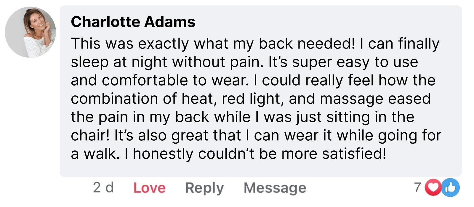 This belt changed my life completely! I have had back pain for the past 7 years and I have tried everything to get rid of the pain. This device not only made me pain free, it gave me the ability to walk and play with my children again, something I was rarely able to do without pain.